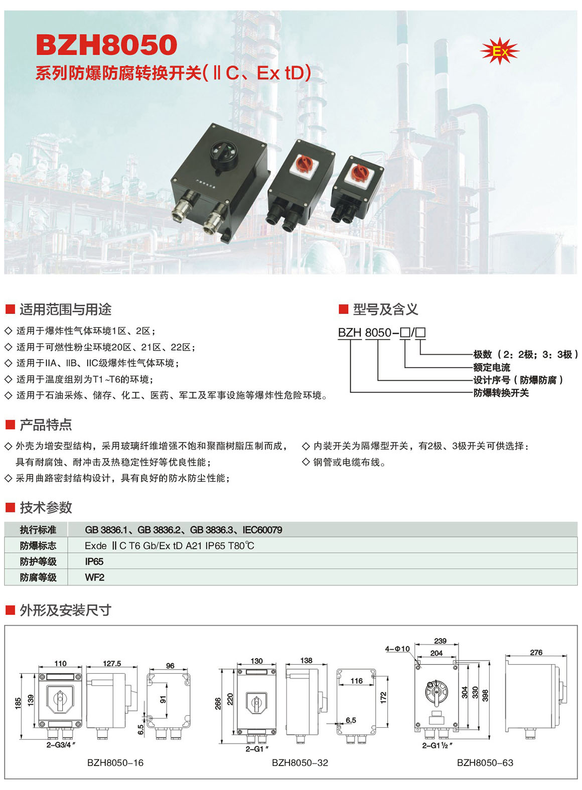 产品中心 防爆防腐电器系列 BZH8050系列防爆防腐转换开关(ⅡC、Ex tD)